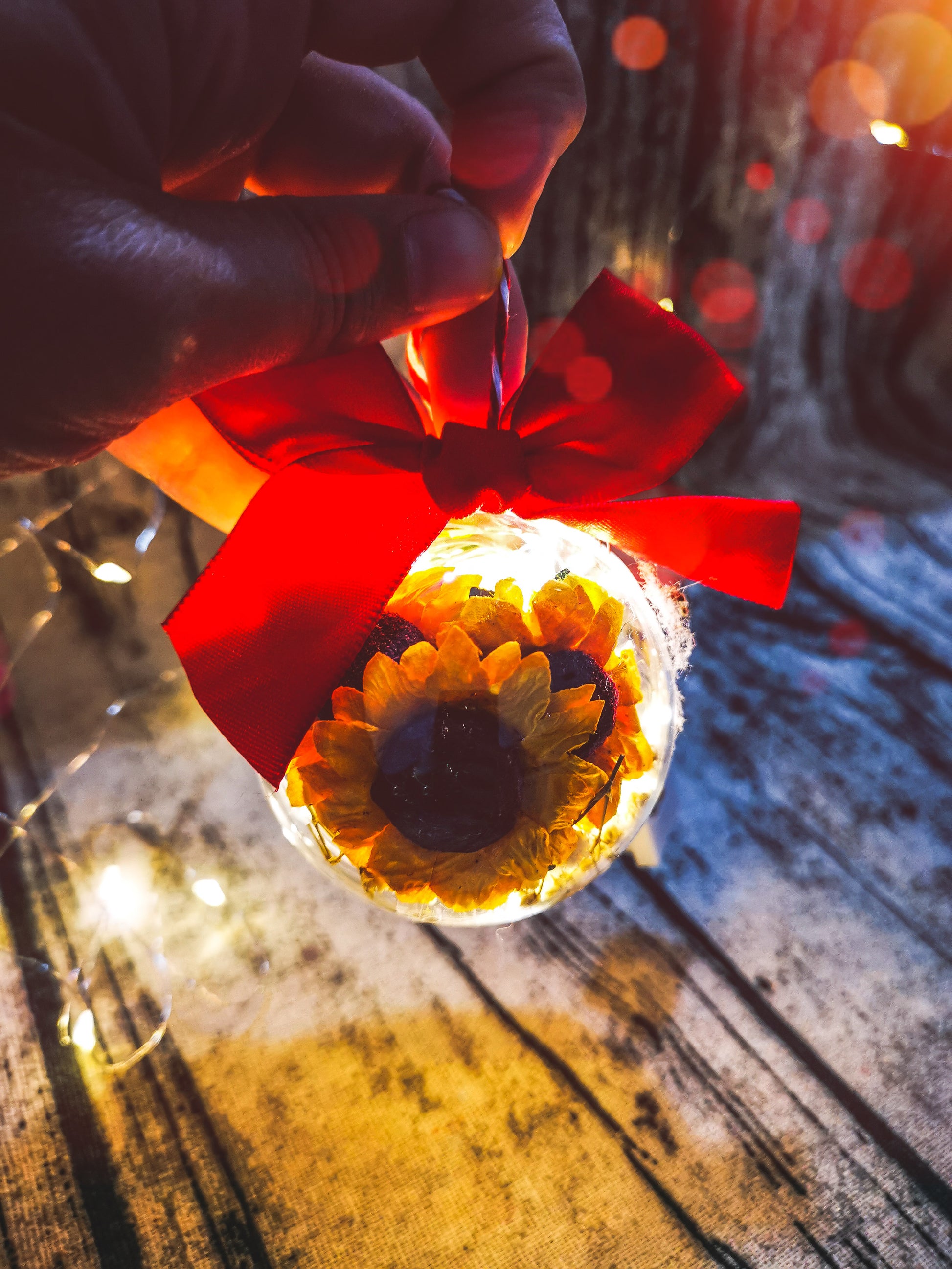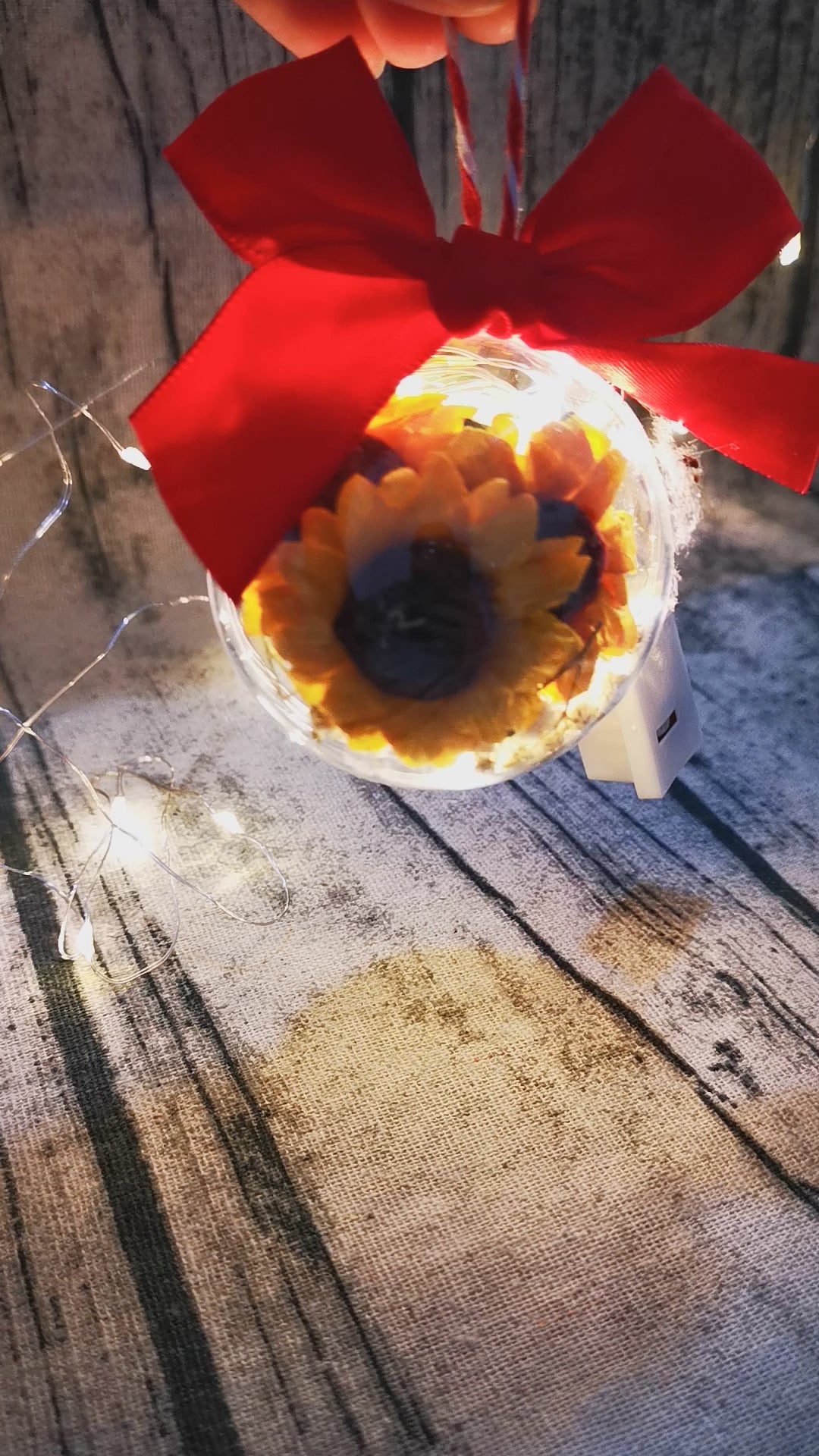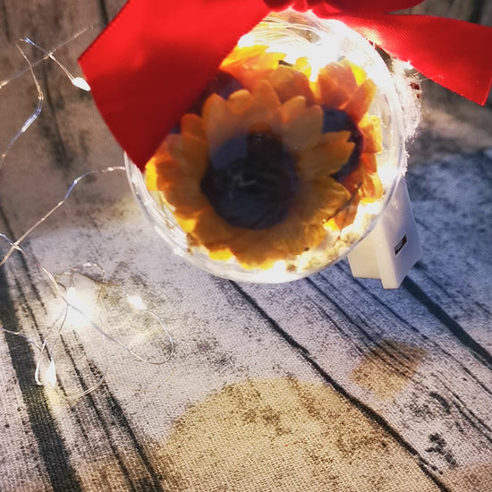 La pallina in plastica trasparente è realizzata da me con dei fiori secchi al suo interno, delle mini lucine con tre modalità di accensione. La misura della pallina è di circa 5/6 cm.