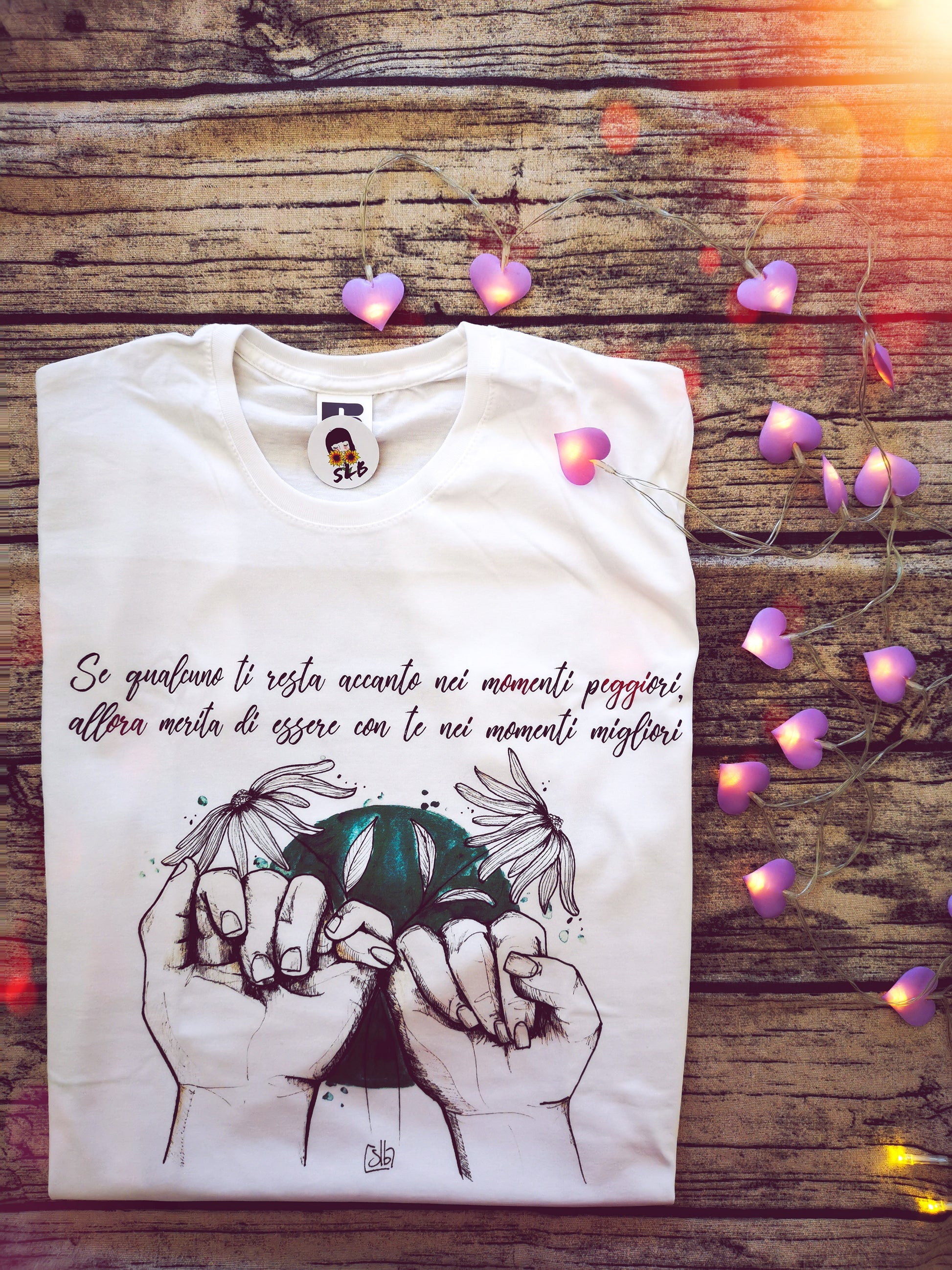 La t-shirt è realizzata al 100% in cotone, garantendo un comfort morbido e traspirante, ideale per ogni stagione. Il design sulla maglietta è unico e fatto a mano, rendendola speciale e originale. Ogni capo è pensato per offrire un tocco di artigianalità e creatività, con un disegno che si distingue per la sua qualità e dettagli.