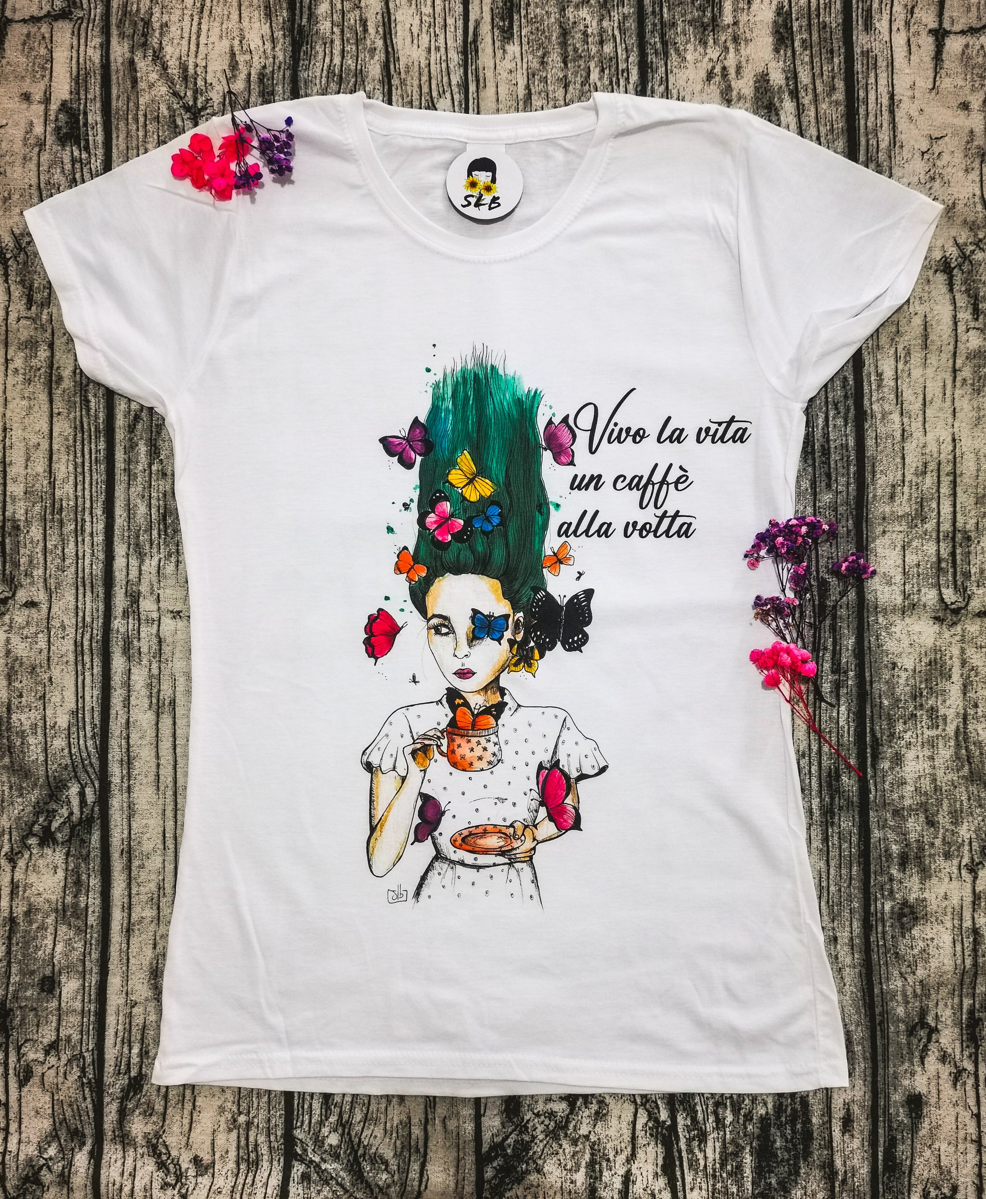 La t-shirt è realizzata al 100% in cotone, garantendo un comfort morbido e traspirante, ideale per ogni stagione. Il design sulla maglietta è unico e fatto a mano, rendendola speciale e originale. Ogni capo è pensato per offrire un tocco di artigianalità e creatività, con un disegno che si distingue per la sua qualità e dettagli.
